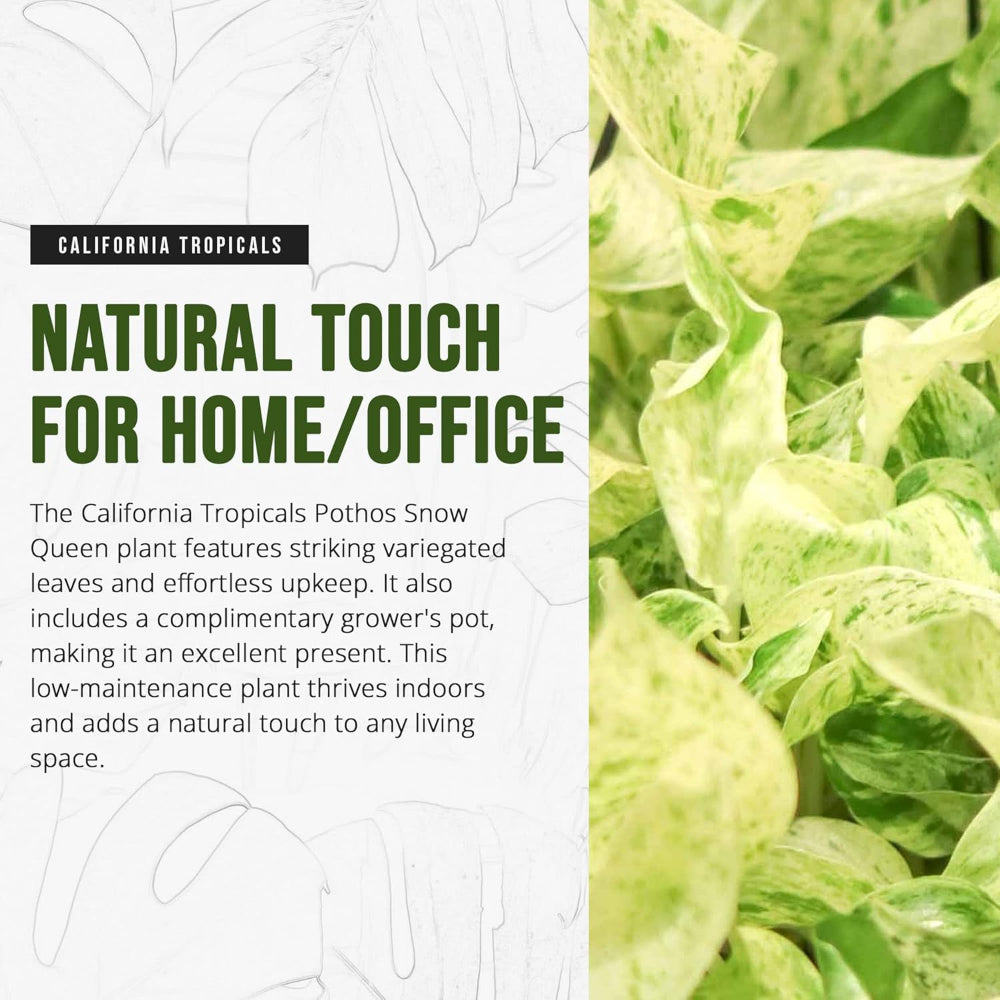Lush variegation for vibrant spaces: Elevate your living spaces with California Tropicals' Pothos Snow Queen—a live plant boasting variegated heart-shaped leaves in enchanting green, white, and marble tones. Its beauty adds a lively touch to any room. Ideal for plant pots indoor, it's the perfect addition to your house essentials for a new home.